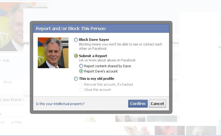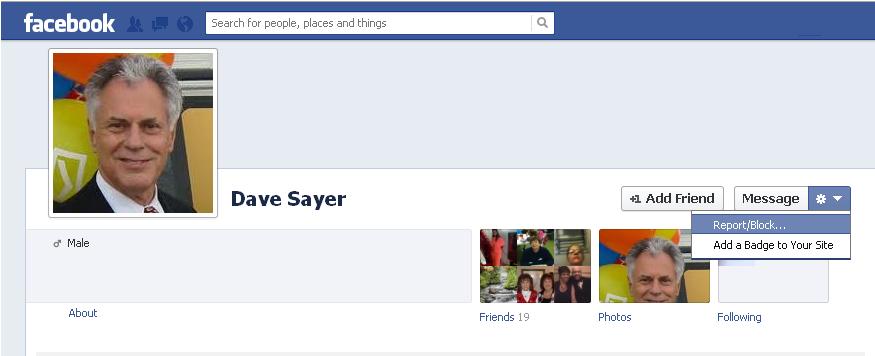 STEP #1: On the fraudulent page, click the “gear” looking image and select “report/block”.